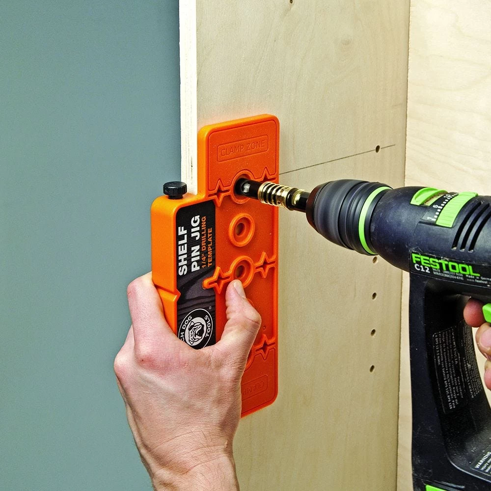 Get level, wobble-free shelves, every time with the new Bench Dog Shelf Pin Jig. The jig is compact and portable, yet works with the tallest of cabinets. Just use the included index pin and self-centering drill bit to daisy-chain your shelf holes to whatever length desired. Can be used when the back and/or face frame are already installed, so it’s ideal for pre-built or site-built cabinets. Features a fence along one edge for use on frameless cabinets and disassembled cabinet parts, while the opposite edge has no fence, and is butted up against the back of the cabinet or the lip of a face frame. Fence features a non-slip rubber material so the jig stays firmly in place while drilling, and onboard storage for the index pin and drill bit keep everything in one convenient place. The Bench Dog Shelf Pin Jig is ideal for 1/4” shelf supports.